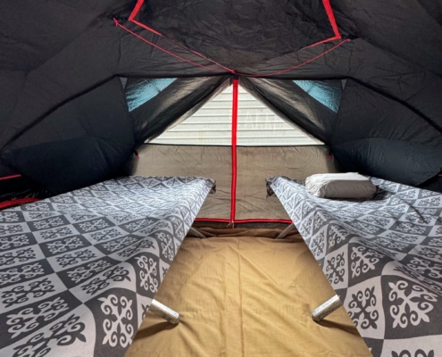 Accommodation: comfortable stationery Camping with twin beds, Wifi in the camp – starlink