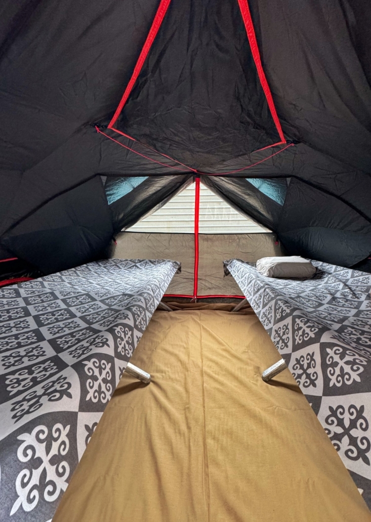 Accommodation: Cozy tented camp with twin beds (single is possible too), kitchen and support car. Starlink Wifi in the camp.