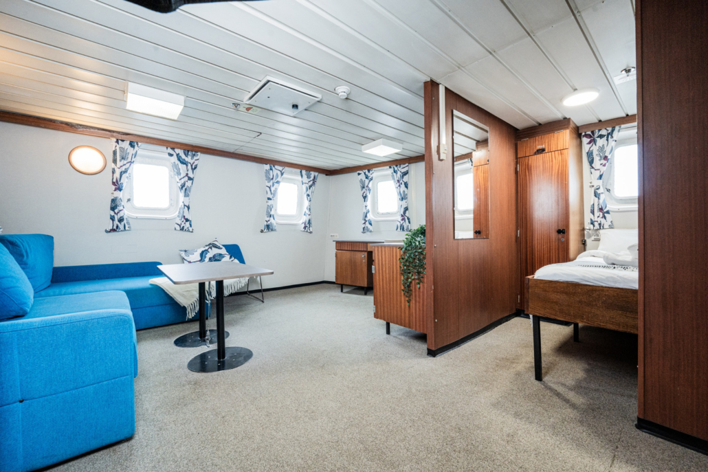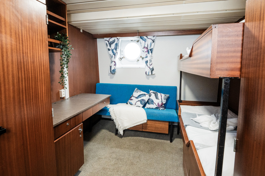 Features: A porthole window (i.e., smaller round window), ensuite shower + toilet.