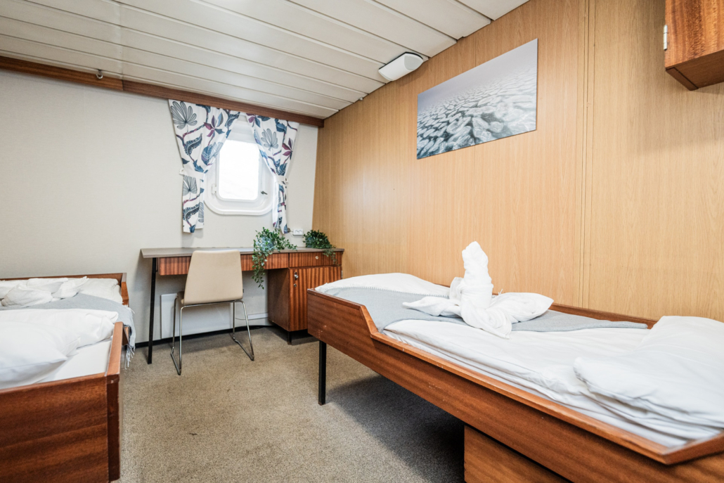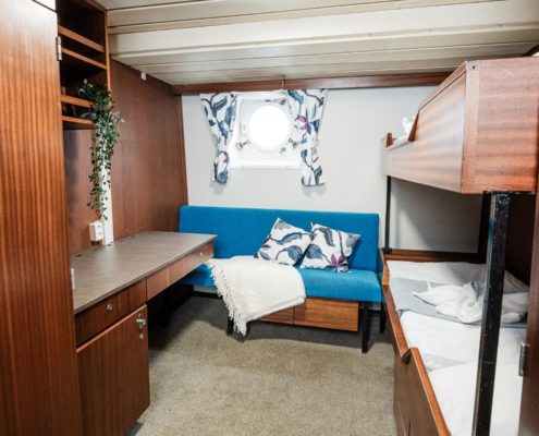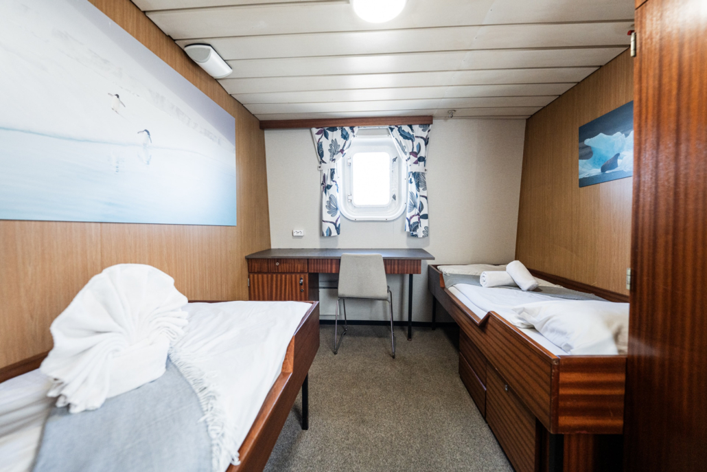 Features: Window (rather than just a porthole), ensuite shower + toilet, wardrobe and dedicated desk area.