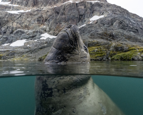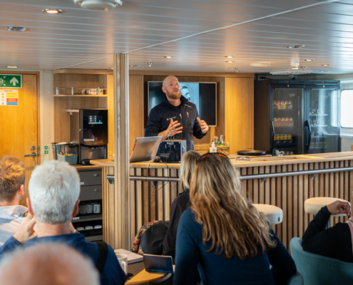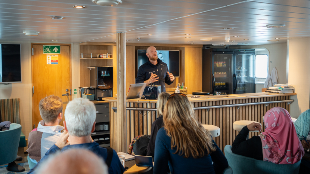 Crossing the Scotia Sea is part of the adventure. Spend time on deck with your camera, capturing seabirds and dramatic seascapes. Between photographic opportunities, enjoy expert-led talks and workshops on South Georgia’s wildlife, history, and geology. By day three, the first snow-covered peaks of South Georgia appear on the horizon—an unforgettable sight.