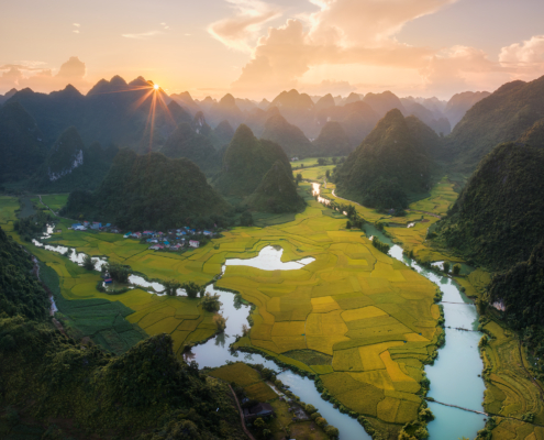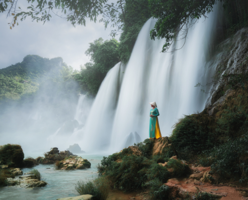 We depart Hanoi in the morning and travel north toward Cao Bang Province, where the landscape gradually transforms from flat plains into dramatic limestone mountains and river valleys. A scenic lunch stop breaks the journey before we continue toward the Chinese border region, one of Vietnam’s most remote and visually striking areas. By late afternoon we reach Ban Gioc Waterfall, the largest waterfall in Vietnam, set against towering karst cliffs and surrounded by lush greenery. During sunset, warm side light illuminates the cascades while mist rises from the water, creating ideal conditions for long exposures and layered compositions. The scale of the falls combined with the surrounding mountains offers opportunities for both wide panoramic views and telephoto detail studies. Drone flights here are operated under local regulations, and our team arranges the necessary permits in advance so participants can work legally and safely. Overnight at Ban Gioc Saigon Hotel, conveniently located close to the waterfall.