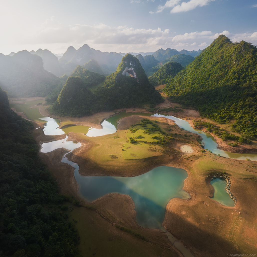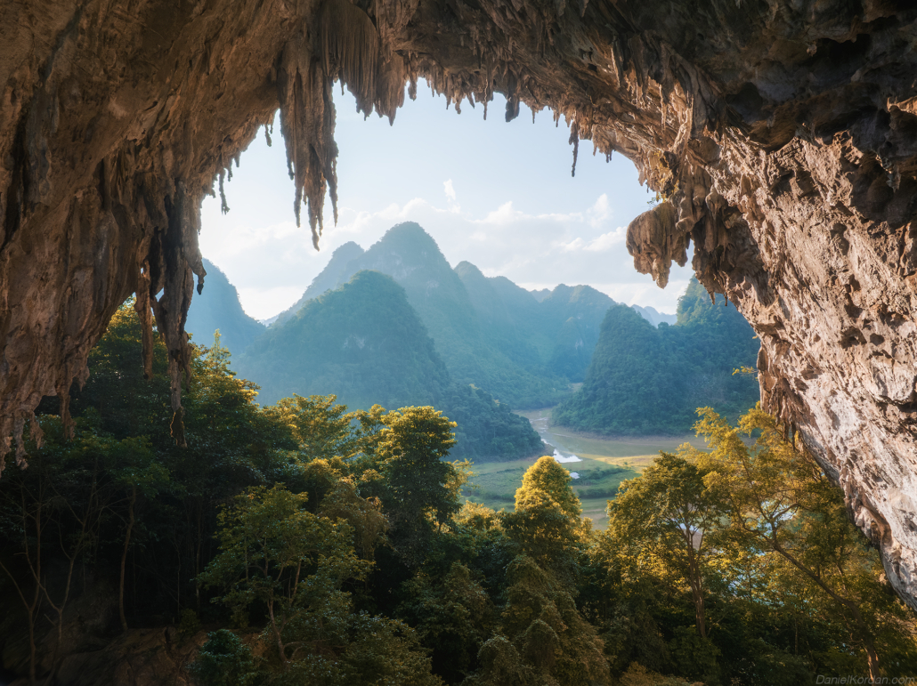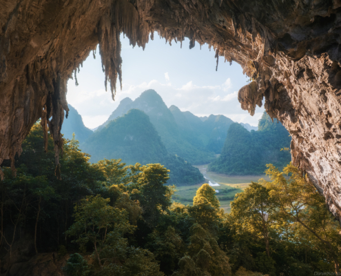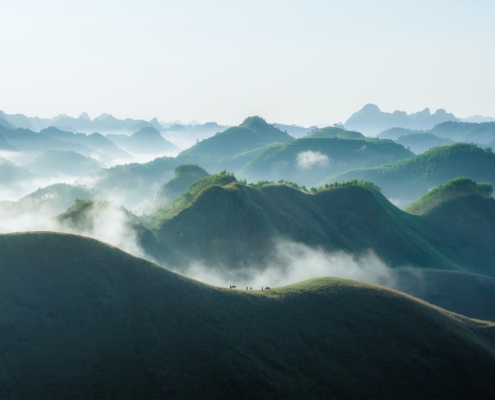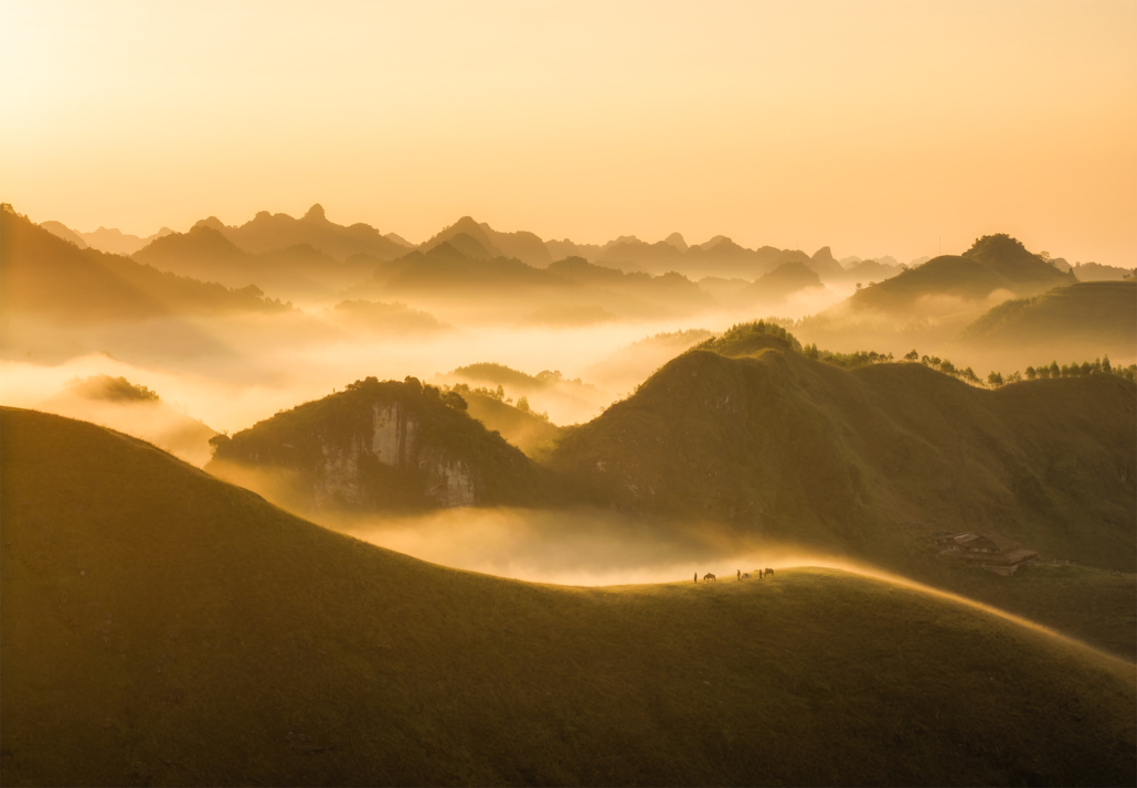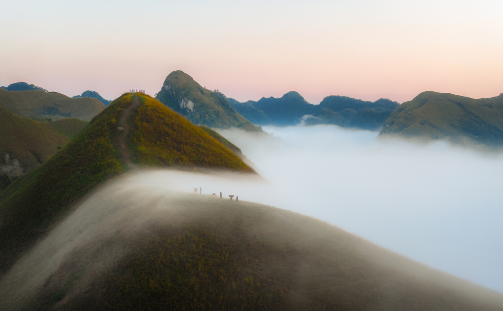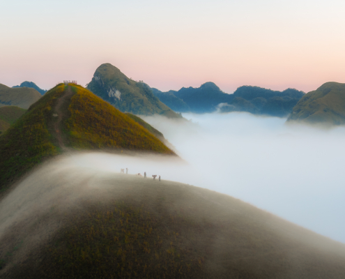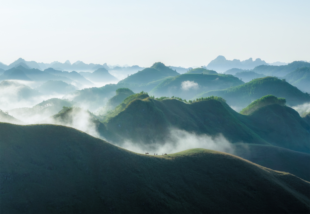 Sunrise begins in Phong Nam Valley, where early fog frequently moves between limestone peaks and farmland, producing layered atmospheric scenes ideal for telephoto compositions. Later we travel to God Eye Mountain (Núi Mắt Thần), one of Vietnam’s most unique geological formations, distinguished by a large circular hole through the mountain that resembles an eye. The surrounding grasslands, grazing animals, and open terrain provide excellent opportunities to explore scale, symmetry, and drone perspectives. In the evening we photograph from Vinh Quy Hill, known for its rolling hills, cultivated slopes, and gentle haze that softens the landscape into harmonious tonal layers. This area is less visited, offering clean, uncluttered compositions that emphasize shape and rhythm in the terrain. Overnight at Ba Quang Panorama, positioned for access to sunrise viewpoints.